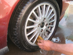 洗い流して、2回目。さらにゴシゴシやって洗い流すと、タイヤのきれいな黒い地肌が見えてきます。新品みたいに。