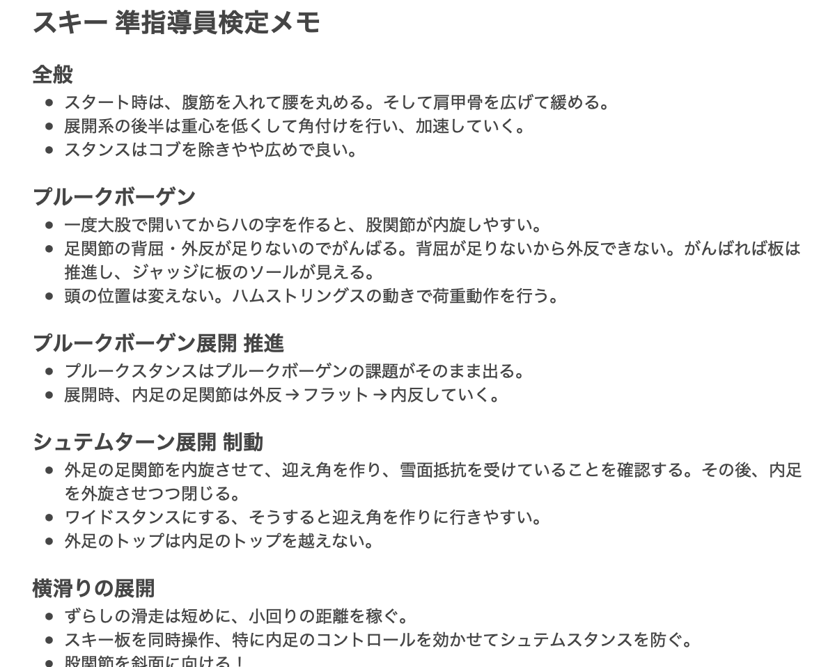 これらを踏まえて、特に受検された方は何度も聞いたはずですが、学びを「言語化」し理解を深め、そして「自動化」できるほどに自然と動きに表現できるまで練習を続けることになります。言語化ですが、家に帰ってからスキー教程を読みながら「こういうことだったのか」と振り返り、ノートに取ると結構効果的なのでお勧めです。僕のものの一部をお見せします。
